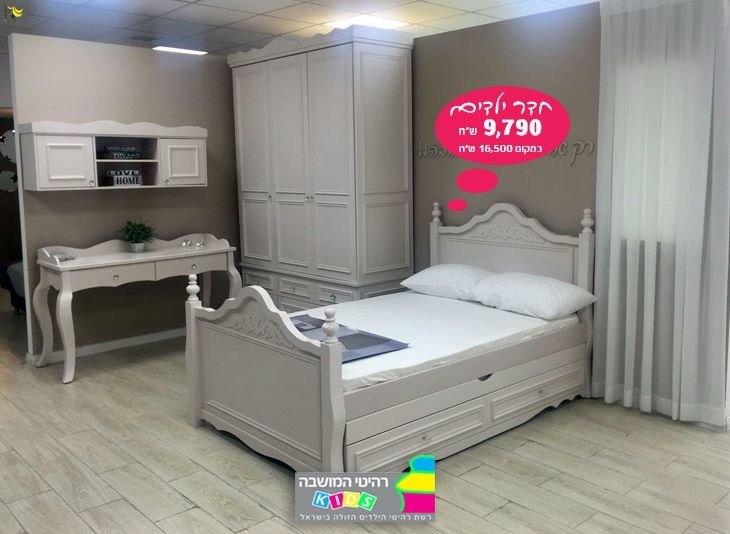 חדר ילדים בסגנון לואי וינט'ג דגם נוברס הכולל מיטה 120/190 + מיטת חבר + סט מגירות איכסון + שולחן כתיבה 120 +כוורת נתלת לקיר + ארון 3 דלתות 120 על 240